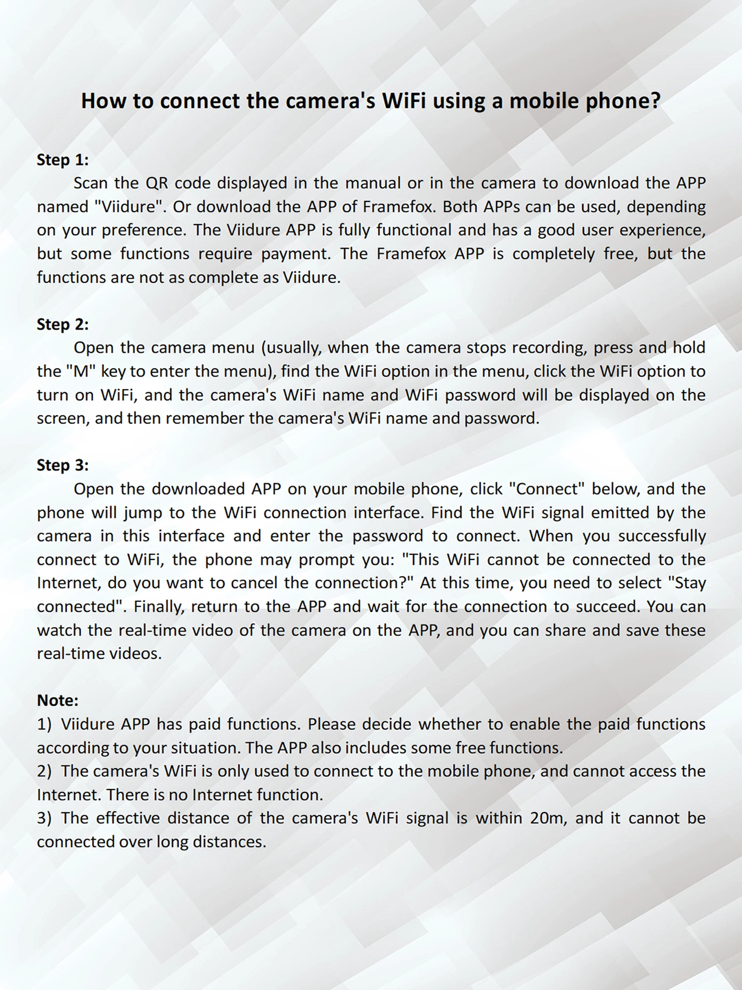 You need to press and hold the M menu button for 2-4 seconds, then it will display the settings menu, find the “WiFi and APP” setting and turn it on, the APP download QR code is also in the menu bar. According to the information displayed on the device, connect the device’s WiFi, and finally you can connect the phone and watch the video in the mobile phone APP.