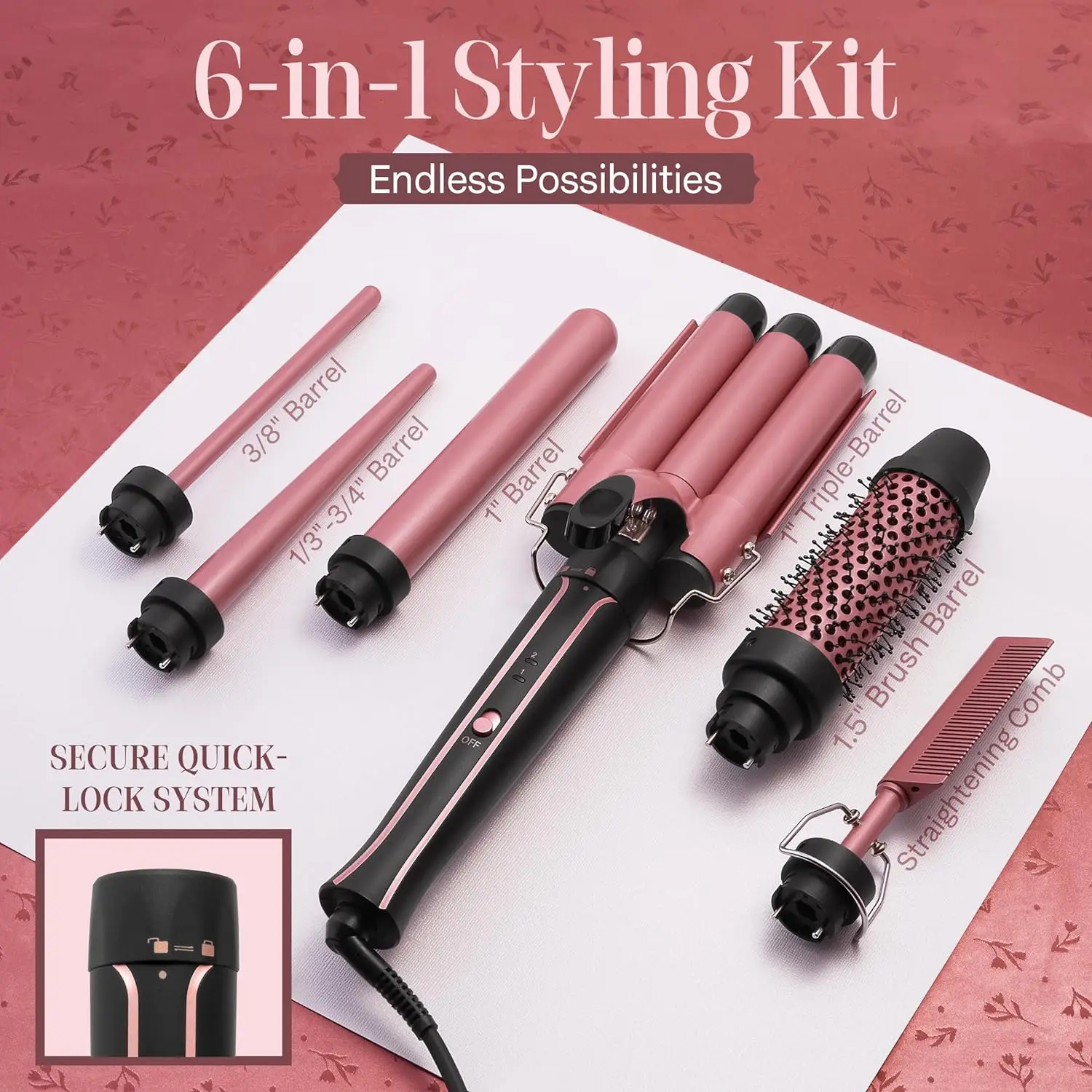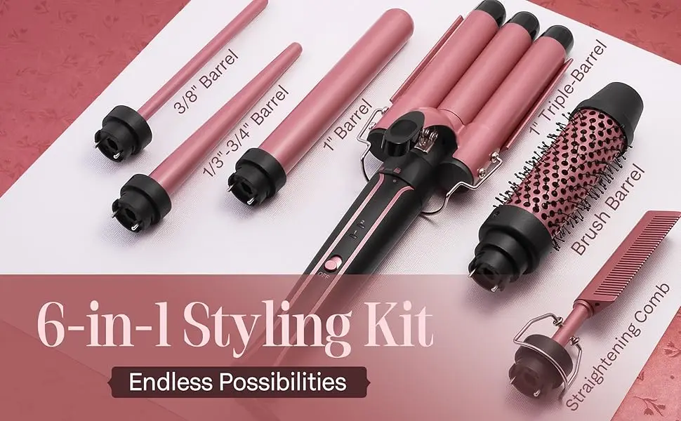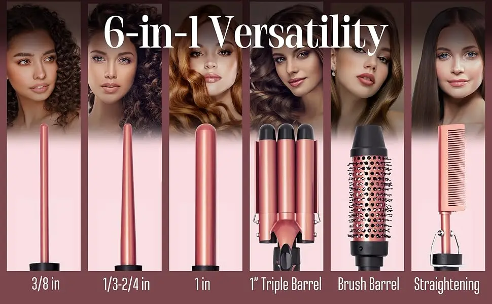 DIVERSE STYLES, ONE KIT: Our 6-in-1 curling iron wand set includes a 1 inch 3 barrel hair crimper for beach waves, a 1-inch classic for big curls,, a ⅓”-¾” inch tapered barrel for tapered curls, ⅜” inch small barrel for tight curls, a 1.5″ brush barrel for straightening or curling, and a hot comb for straightening.